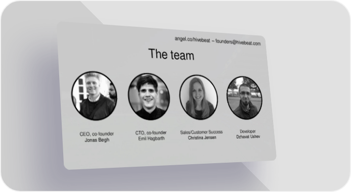 CEO, co-founder Jonas Bøgh CTO, co-founder Emil Hagbarth Sales/Customer Success Christina Jensen The team Developer DzhavatUshev angel.co/hivebeat–[email protected]