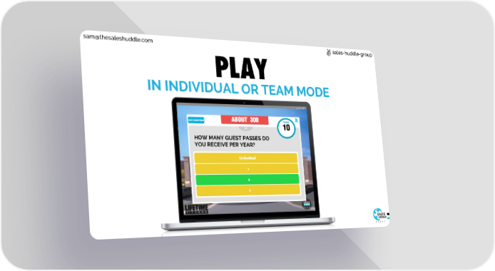 sam@thesaleshuddle.com sales-huddle-group PLAY IN INDIVIDUAL OR TEAM MODE HOW MANY GUEST PASSES DO YOU RECEIVE PER YEAR?