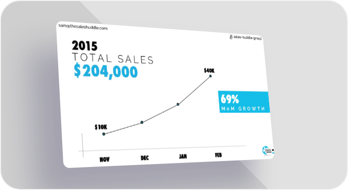 sam@thesaleshuddle.com sales-huddle-group 2015 TOTAL SALES $204,000 $40K 69% MoM GROWTH $10K NOV DEC JAN FEB