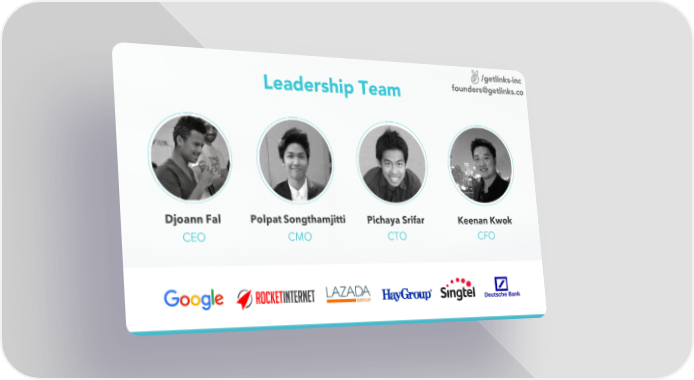 /getlinks-inc Leadership Team founders@getlinks.co Djoann Fal Polpat Songthamjitti Pichaya Srifar Keenan Kwok CEO CMO CTO CFO #links Page 11 Page 13