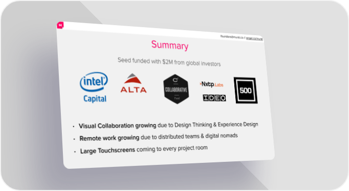 [email protected] // angel.co/mural. Summary Seed funded with $2M from global investors • Visual Collaboration growing due to Design Thinking & Experience Design • Remote work growing due to distributed teams & digital nomads • Large Touchscreens coming to every project room