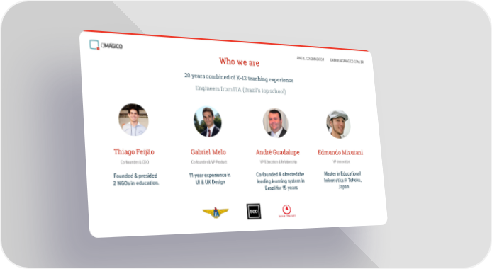 ANGEL.CO/QMAGICO-1 [email protected] Who we are 20 years combined of K-12 teaching experience Engineers from ITA (Brazil’s top school) Thiago Feijão Gabriel Melo André Guadalupe Edmundo Mizutani Co-founder & CEO Co-founder & VP Product VP Education & Relationship VP Innovation Founded & presided 11-year experience in Co-founded & directed the Master in Educational 2 NGOs in education. UI & UX Design leading learning system in Informatics @ Tohoku, Brazil for 15 years Japan