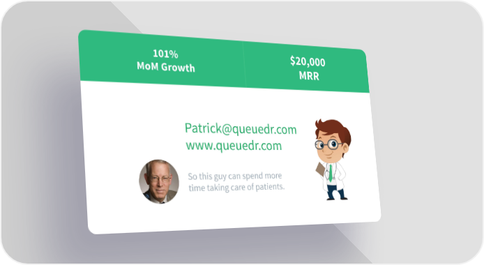 101% $20,000 MoM Growth MRR [email protected] www.queuedr.com So this guy can spend more time taking care of patients.