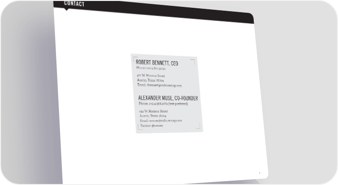 CONTACT ROBERT BENNETT, CEO Phone: 1+214.641.9092 411 W. Monroe Street Austin, Texas 78704 Email: rbennett@culturemap.com ALEXANDER MUSE, CO-FOUNDER Phone: 1+214.558.1079 (text preferred) 411 W. Monroe Street Austin, Texas 78704 Email: amuse@culturemap.com Twitter: @amuse 2015 CULTUREMAP MEDIA KIT 7