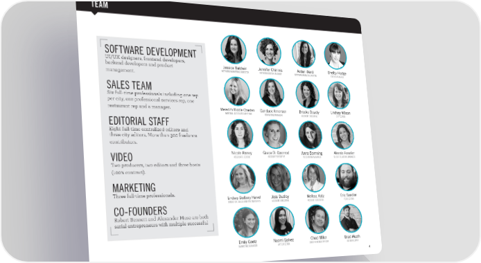 TEAM SOFTWARE DEVELOPMENT UI/UX designers, frontend developers, backend developers and product management. SALES TEAM Six full-time professionals including one rep per city, one professional services rep, one restaurant rep and a manager. EDITORIAL STAFF Eight full-time centralized editors and three city editors. More than 300 freelance contributors. VIDEO Two producers, two editors and three hosts (100% contract). MARKETING Three full-time professionals. CO-FOUNDERS Robert Bennett and Alexander Muse are both serial entrepreneurs with multiple successful 2015 CULTUREMAP MEDIA KIT 4